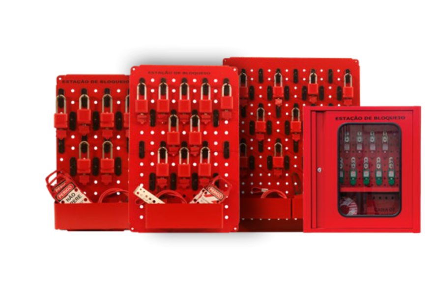 Cadeados de bloqueio, garras de bloqueio, bloqueio de disjuntores e vávulas, etiquetas de identificação, caixas de travamento e outros